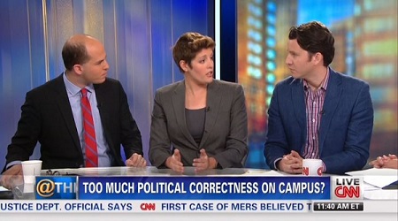 BRIAN STELTER: ...I get excited when I see students protesting and trying to figure out what the boundaries of free speech are. These are students that have grown up in the 9/11 age and in the Occupy age. And I understand, for example, on that campus where they were upset about how those students were treated on – was it U.C. Davis? Where those kids were sprayed – that was disgusting! And I like that those students stood up against it.