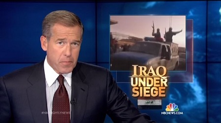 Williams led the evening newscast by detailing the ongoing advance of jihadists towards Baghdad: "Their name is ISIS [Islamic State of Iraq and al-Sham (Syria)]. They're heavily-armed; highly motivated – they are ruthless fighters. They've carried out daytime crucifixions to make their point. They have swept from Syria to the east, and are rolling across Iraq. And on their way, they've taken over major cities; some oil facilities; some U.S. weapons and vehicles."