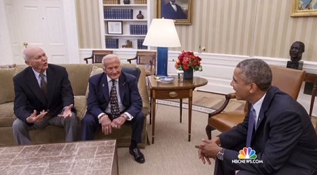 BRIAN WILLIAMS: They are old men now, but 45 years ago this week, they were the young astronauts on their way home from the Moon. That's Michael Collins on the left. He piloted the command module. Next to him is Buzz Aldrin, second man on the Moon. With them in spirit in the Oval Office today was the late, great Neil Armstrong. They were the three men who won the space race for the United States, and answered President Kennedy's challenge to conquer the moon.