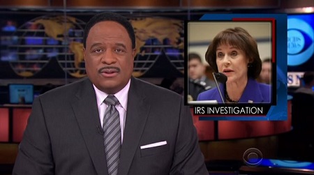 On CBS Evening News, substitute anchor James Brown teased correspondent Chip Reid's report at the top of the program by noting "Lois Lerner's e-mails – the former I.R.S. official calls Republicans 'crazies' and worse." Seven minutes later, Brown pointed out that "it turns out not all of Lois Lerner's e-mails were lost when her computer crashed. Lerner is the former I.R.S. official at the center of investigations over whether the agency targeted conservative groups for special scrutiny. E-mails she sent on her Blackberry surfaced today."