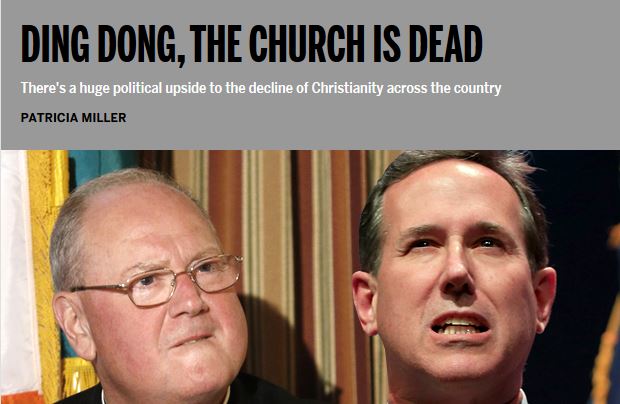 After using her "good news for the country" claim about the decline of the Church, the left-wing author concluded that "Catholics will have literally voted with their feet, abandoning the religion of their birth to help create a new coalition of modern freethinkers and freelancers that can oppose many of the very policies their old leaders insist on clinging to and insist will be their salvation."