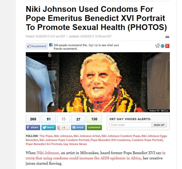 Well, no. That would be newsworthy. Instead, HuffPo’s “Gay Voices” page is celebrating a portrait of Pope Emeritus Benedict XVI made from condoms. According to HuffPo’s super-impressed Megan Griffo, Milwaukee artist Niki Johnson “hopes to take aim at the church's stance on using condoms, but also promote sexual diversity and a more open discussion about sexual health.” These young idealists, out to change the world with their condom art!