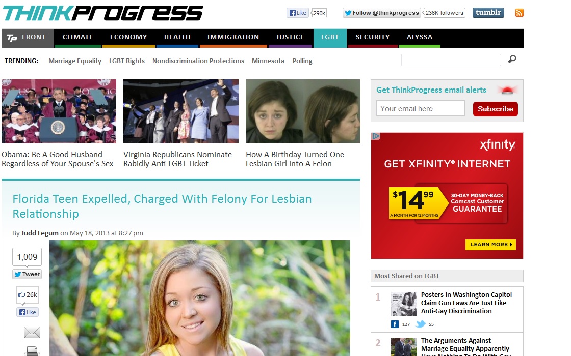 ThinkProgress quoted Hunt’s mother talking about the underage girl’s parents: “they feel like my daughter “made” their daughter gay. They are bigoted, religious zeolites [sic] that see being gay as a sin and wrong, and they blame my daughter.” [emphasis in original]