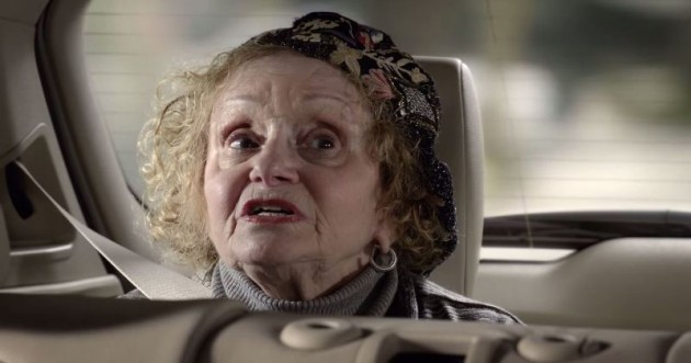 In the ad, Granny, the annoying back seat driver, is in the third row of the car, with her grandkids in the second row, Mom driving and Dad riding shotgun. Looking at the interior, Granny says, “This leather is fancy.”