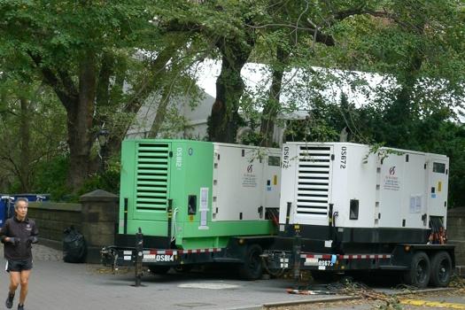 The New York Post reported earlier today that there are three tractor-trailer-sized electrical generators sitting 24/7 in Central Park in the city devoted solely to providing power to the reporters and camera crews looking to cover the marathon. They are being paid for by the New York Road Runners Club, the private organization which puts on the race. One of the generators, however, is sitting completely idle functioning solely as a backup in case one of the other two generators fails.