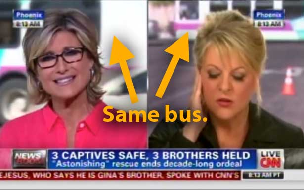 Later, Banfield would conduct another interview (this time about Arias) with another Headline News host who was in a different location than Grace, but still in the same parking lot; plus a third HLN regular somewhere else in the Phoenix area. (Also, outdoors and presumably close by.) And don't forget the CNN reporter who is standing across the street from her, waiting in front of the courthouse. A four-headed interview with four people in the exact same city covering the exact same story on at least three different programs on two different networks owned by the same company. So much for corporate synergy.