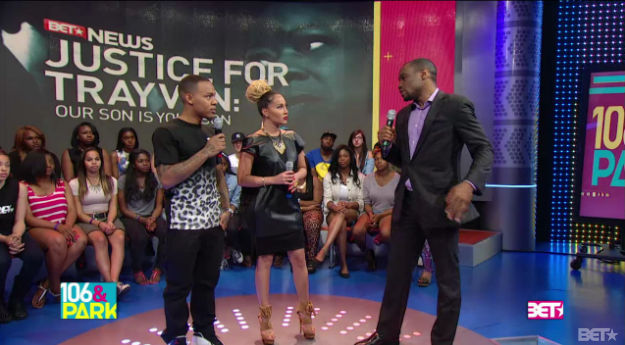 Right before the special aired, the network brought ultra-partisan Democrat Marc Lamont Hill on its popular “106 & Park” music video show to discuss the Zimmerman case. Hill proceeded to attack Florida’s “Stand Your Ground” law which he alleged “allowed Trayvon to get killed in the first place.” Of course, laws being immaterial things cannot cause the death of anyone. Regardless of whether Zimmerman decides to use that law in his defense, it would not have “allowed” Martin to be killed.