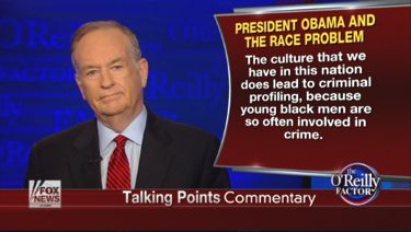 On his program last night, Fox News Channel host Bill O'Reilly applauded President Obama for speaking out about the George Zimmerman verdict but argued that Obama, and the self-proclaimed civil rights leadership have been avoiding the larger issues facing black Americans.
