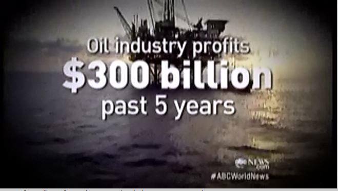 “The American oil industry, with net profits of more than $300 billion over the last five years, says big oil and the nation’s drivers cannot afford to pay even a penny more to further reduce the amount of air polluting sulfur in gasoline,” Avila said sternly, while the number “$300 billion” hovered over a graphic of an offshore oil rig.