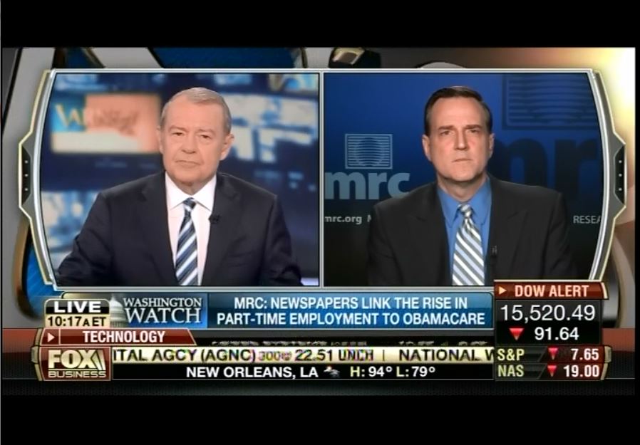 "We've got major employers -- Subway and Hardees and Regal Entertainment -- that have announced that Obamacare is impacting how they hire," Gainor said. "We've got these huge, part-time statistics, two thirds of the jobs were just added Friday, to this 162,000 jobs number that was already disappointing, are part time. So you'd think the networks would make the connection, but we've looked at six months of network coverage, and they don't make the connection at all. You can find it in the Wall Street Journal, you can find it in the New York Times, you can find it in the Washington Post -- just not on ABC, CBS or NBC."