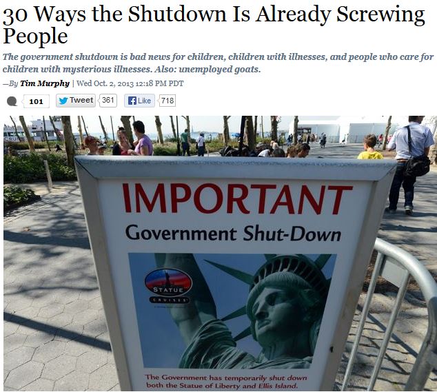 The Oct. 2 article listed “30 Ways the Shutdown Is Already Screwing People.” Most of the items on this list wee the same talking points that the left has brought up time and again, but some were actually quite strange. The list included: