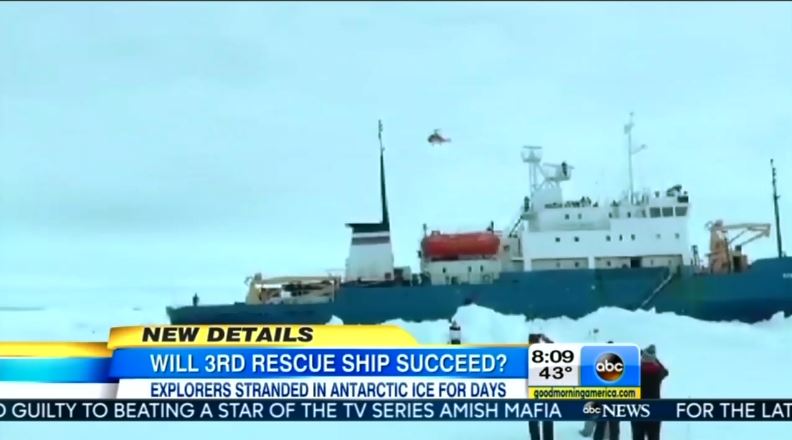 So far, three rescue attempts have been thwarted by growing levels of sea ice and weather conditions. The passengers are now expected to be airlifted by helicopter, according to The Associated Press. ABC’s “Good Morning America” reported Dec. 30, that “the ice could be as thick as 13 feet.”