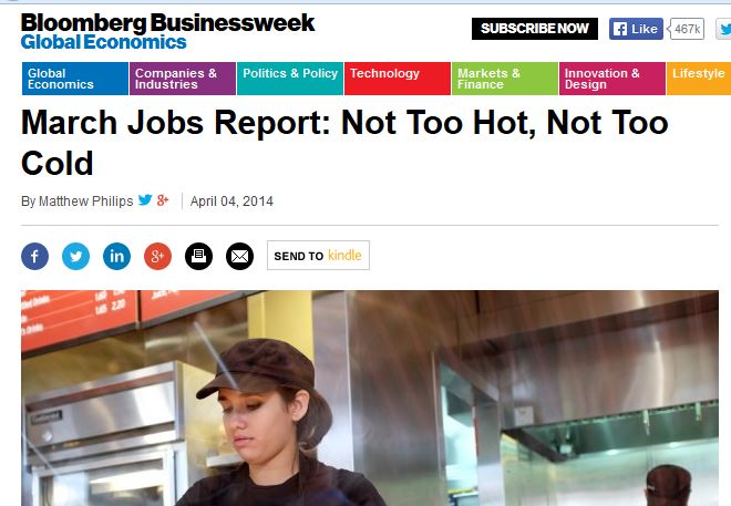 Bloomberg Businessweek, The Washington Post’s Wonkblog, and a guest on CNBC all claimed that the jobs report was “not too hot, not too cold.” This is called the “Goldilocks effect,” after the classic childhood story. The argument was that if the jobs report is too good, the Federal Reserve will speed up the taper, which would “trigger a sell off in bonds,” according to the Bloomberg Businessweek article.