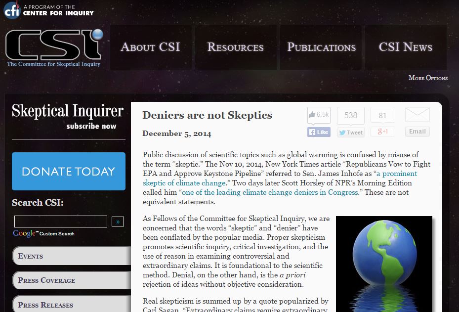 But CSI’s definition of the terminology undermined its own argument. “Not all individuals who call themselves climate change skeptics are deniers. But virtually all deniers have falsely branded themselves as skeptics. By perpetrating this misnomer, journalists have granted undeserved credibility to those who reject science and scientific inquiry.”