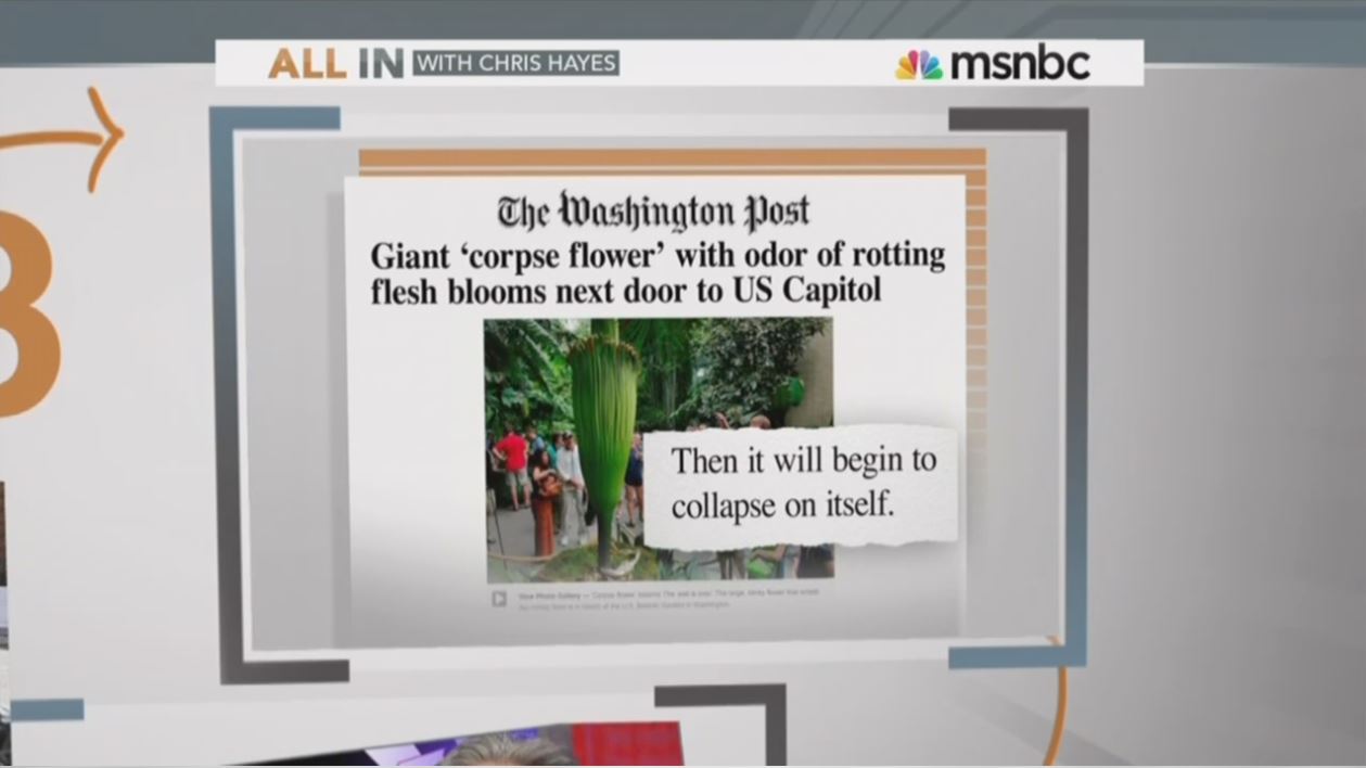 CHRIS HAYES: At long last the wait is over. After months, years really, of anticipation, it has happened. Washington's corpse flower has bloomed. This, my friend, is America’s royal baby. You're looking at it, Titan Arum, a giant rainforest plant living in the U.S. Botanical garden right next to the capitol. In layman's terms, it is a giant flower that smells oddly like rotting flesh. The last time one of these things bloomed in America George W. Bush was president. As the "Washington Post" reports, experts have been anticipating its bloom for more than a week, extending visiting hours. The corpse flower is now at its peak smell. That's a real thing, and will remain open for the next few days. After that, the flower will begin to collapse in on itself, embarking on a trajectory very similar to Michelle Bachmann’s congressional career.