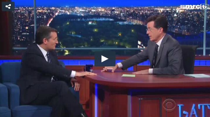 Colbert’s audience rudely began to boo as Cruz explained the tenth amendment and asserted the definition of marriage should be up to democratic votes in each state, forcing Colbert to chastise those in the Ed Sullivan Theater: “No, no, guys, guys, however you feel, he’s my guest, so please don’t boo him.”