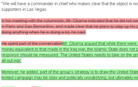 The original headline when the story was first published was “Obama Visiting National Counterterrorism Center.” Less than two hours later, the headline was “Obama, at Counterterrorism Center, Offers Assurances On Safety.” Then the headline was changed to “Frustrated by Republican Critics, Obama Defends Muted Response to Attacks.” Two hours later, the headline was once again revised to “Under Fire From G.O.P., Obama Defends Response to Terror Attacks.” The most recent headline revision, which accompanied the deletion of the passage where Obama admitted he didn’t understand the American public’s anxiety about terrorism, now reads, “Assailed by G.O.P., Obama Defends His Response To Terror Attacks.”
