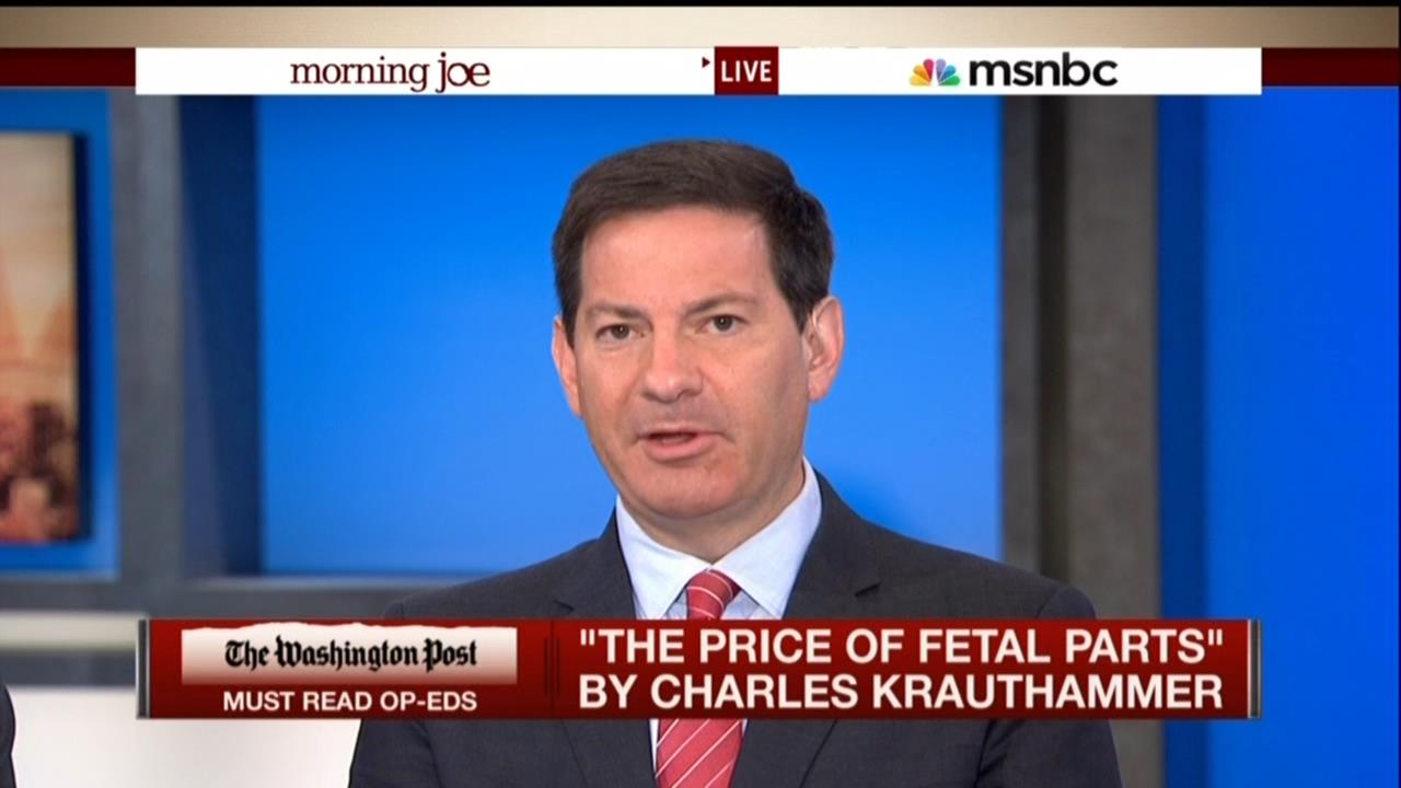 July 24, 2015MIKA BRZEZINSKI: Right. Let me read from the Washington Post. Here’s what Charles Krauthammer writes. The Price of Fetal Parts: ‘Just as ultrasound altered feelings about abortion by showing the image, the movement, the vibrant livingness of the developing infant in utero, so, too, I suspect will these Planned Parenthood revelations’, I’m sure you all have seen this, ‘by throwing open the door to the back room of the clinic where that being is destroyed. The effect on the public is a two step change in sensibilities. First, when ultrasound reveals how human the living the human fetus appears. Next, when people learn, as in these inadvertent admissions, what killing the fetus involves. The role of Democratic politics is to turn such moral