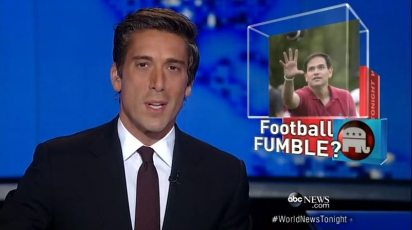 After the networks spent 18 seconds on Tuesday night and two minutes and 43 seconds Wednesday morning on the video, anchor David Muir spent another 18 seconds promoting “one unscripted moment from the campaign trail” with the football from Rubio “bumping into the guy’s head instead of landing in his hands.”