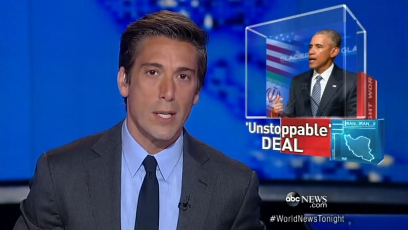 Even though the American people remain largely opposed to the deal (along with a majority of their representatives in Congress), ABC’s World News Tonight anchor David Muir still hailed it as “[a] big victory for President Obama” despite it coming “under fire, of course, from Republicans threatening to defeat it” (having failed to mention how two Democratic Senators oppose it).