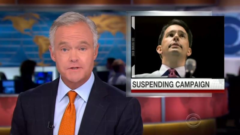 Anchor Scott Pelley introduced a brief soundbite from Walker announcing the suspension of his campaign by explaining that Walker follows former Texas Governor Rick Perry dropping out on September 11 and that he “was a rising star, but he barely registered in the polls after weak performances in the first two debates.”