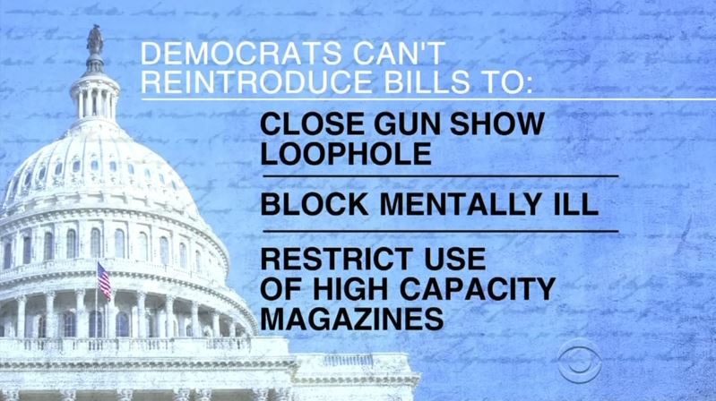 The CBS reporter then complained that Senate Minority Leader Harry Reid “has even fewer votes today” than in 2013 since Reid’s “Democrats lost control of the Senate in 2014, and can't reintroduce bills to close the gun show loophole, block more of the mentally ill from buying guns or restrict use of high-capacity magazines.”