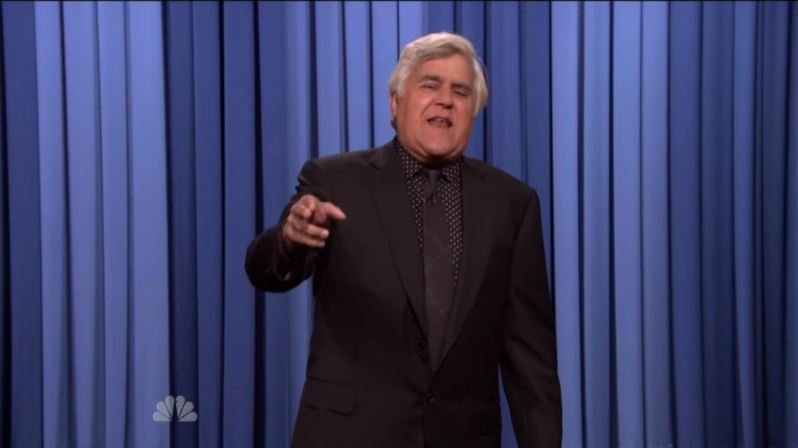 Promoting his new car show set to premiere Wednesday night on CNBC, Jay Leno made his return to NBC’s The Tonight Show on Tuesday night to give a portion of the opening monologue. He poked fun at Hillary Clinton, Martin O’Malley, Republicans, ObamaCare, and the economy to name a few targets.