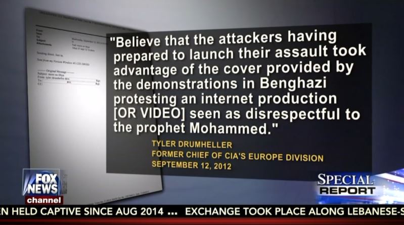 The new emails show on September 11th, 2012, the night after the attacks, Clinton received a message written by Drumheller, in which the former C.I.A. officer declared his sources, quote, “believe that the attackers having prepared to launch their assault took advantage of the cover provided by the demonstrations in Benghazi, protesting an internet production [OR VIDEO] seen as disrespectful to the prophet Mohammed.”