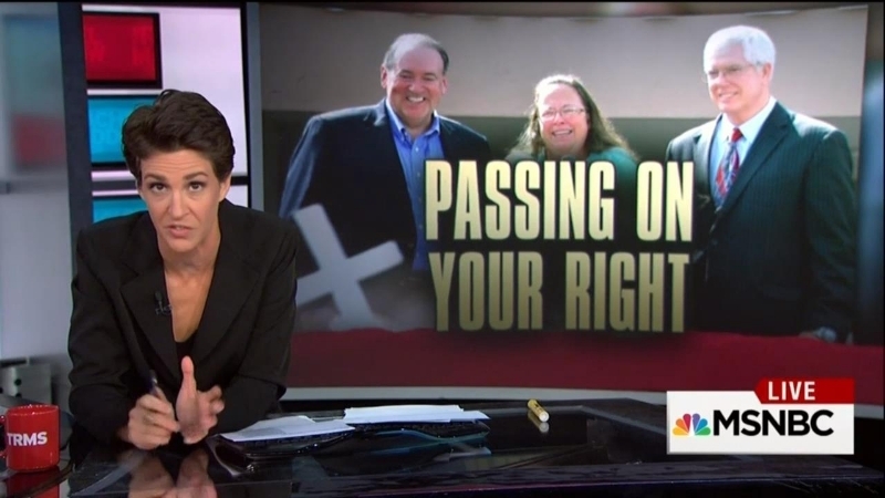 Kim Davis is by no means the only person in the country who's in that particular contempt of court boat. I mean, there are local officials in Oregon and in Texas who have been fighting for the right to deny gay people marriage licenses. In Alabama at least 10 counties and potentially as many as 15 counties have stopped issuing marriage licenses altogether in order to keep gay people from getting married, just like Kim Davis did. In North Carolina, more than 30 local magistrates are refusing to issue marriage licenses. So Kim Davis in Kentucky is not alone -- she's just the one who so far has gotten Republican politicians fighting amongst themselves in the most junior high way possible, including physically fighting over her, and her case of course is the national news story right now.