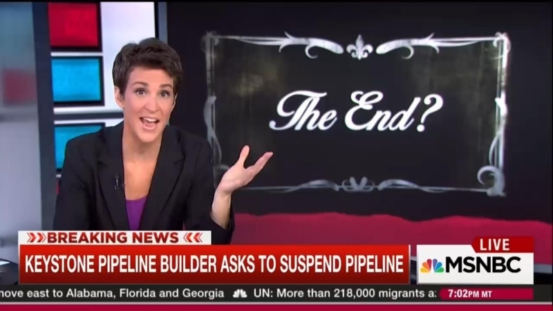 The Keystone pipeline has been an object of debate and protest and anger and attack ads and political suspense and even international tension between the United States government and the Canadian government for years and years and years now. But tonight, all of a sudden, after all of these years of fighting over it, tonight it seems like it's all over -- Keystone is dead. We have just learned late tonight that the company trying to build that oil pipeline has essentially thrown in the towel. The company who was going to build Keystone XL is called TransCanada and TransCanada has just asked the US government to suspend their permit application to build Keystone. The US government, all these years, has not made a decision on whether or not to approve that application or not but TransCanada tonight has pulled the plug on it themselves. This was an unexpected result in what has been just a years-long process to try to get this pipeline built, something that has led to very acute domestic political pressure in this country.