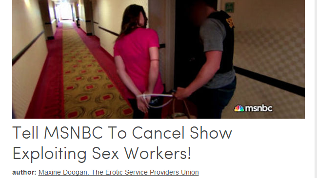 The petition slams MSNBC for conflating human trafficking and voluntary sex work and for depicting arrest and criminalization as a solution to issues that are nuanced and complex.