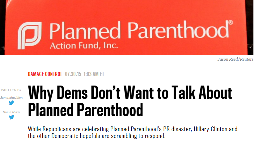 The string of Planned Parenthood sting videos and their shocking revelations will "silence" pro-choice Democrats who are seeking to avoid electoral defeat and/or setbacks against abortion rights, Daily Beast writers Samantha Allen and Olivia Nuzzi argued in their July 30 piece, "Why Dems Don’t Want to Talk About Planned Parenthood."