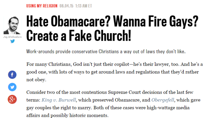 "For many Christians, God isn’t just their copilot—he’s their lawyer, too," writer Jay Michaelson snarked as he opened his August 4 piece, "Hate Obamacare? Wanna Fire Gays? Create a Fake Church!" Apparently Michaelson is miffed that there's a creative, faith-based way around being forced into buying private insurance under ObamaCare, which he dismissed as "legalized gambling," and so used the first half of his piece to mock the religious faith of those who would prefer to get health coverage through pay-sharing co-ops rather than government-regulated insurance exchanges (emphasis mine):