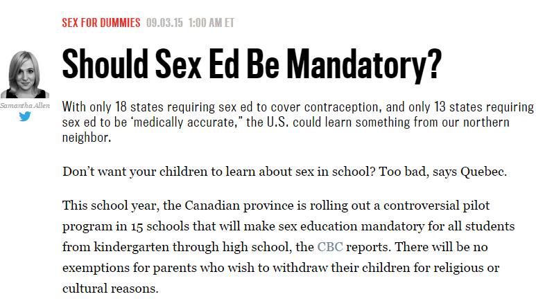 That's the sentiment conveyed by Daily Beast writer Samantha Allen in her September 3 story "Should Sex Ed Be Mandatory?" :