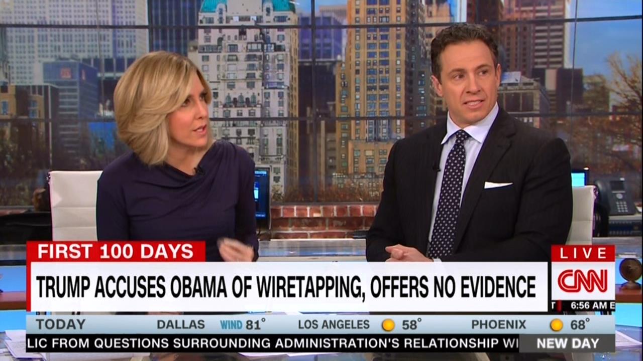 Monday morning on CNN’s New Day, hosts Chris Cuomo and Alisyn Camerota spoke with media correspondent Brian Stelter and analyst Bill Carter about Trump’s claims that he was wire-tapped by President Obama. The CNN panel took the opportunity to not just bash Trump but also blast the “illegitimate” and “partisan” right-wing sources where Trump gets his news.
