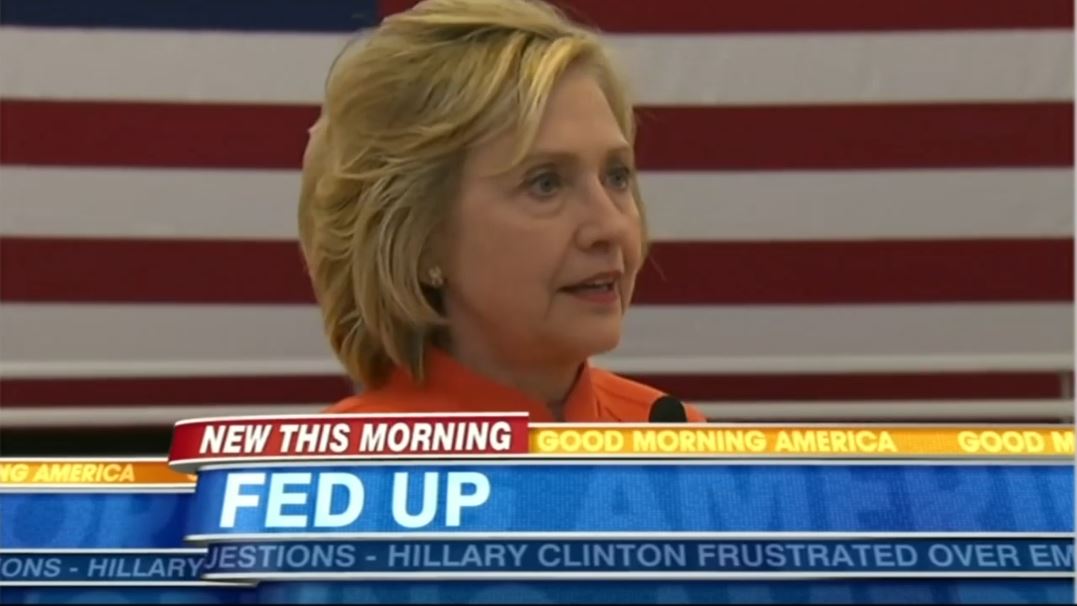Fill-in co-host Amy Robach led off ABC’s Good Morning America by proclaiming: “Fed up. Hillary Clinton defiant, facing questions once again about those e-mails she turned over to the FBI....The Democratic front-runner literally throwing up her hands in frustration.”