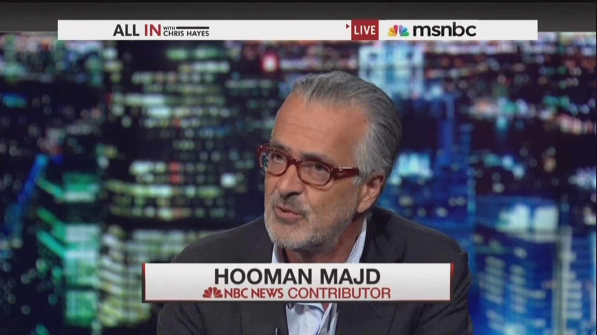 On Chris Hayes' MSNBC show this evening, Hooman Majd claimed the Iran deal is "a good deal for Iran, probably a better deal for the US," and that the US is not giving up anything, that there is no "signing bonus" since "it is Iran's money." In an illogical leap worthy of the man he translated for, Majd argued that it makes no sense to worry about Iran attacking the US or Israel since it hasn't done so yet. Ah, right, Mr. Majd: Iran hasn't gotten the atom bomb yet. That's the point. And for that matter, Iran and its proxies have attacked and killed many Americans and Israelis.