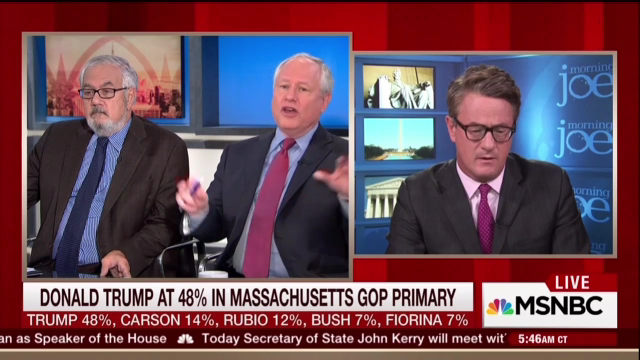 Things boiled over on today's Morning Joe. Despite a fresh poll showing Trump with an astounding 48% of GOP voters in Massachusetts, Kristol blithely declared that Trump "is not going to be the nominee." That elicited sarcastic laughter from Scarborough, who shot back "we can show you clip after clip after clip after clip of your incorrect predictions about Donald Trump and his imminent collapse." Later, Kristol seized on a new poll from Iowa showing Ben Carson having overtaken Trump. Claiming that "you guys have been overestimating Trump and underestimating Carson," Kristol said he was "just trying to be helpful." An exasperated Scarborough exploded: "you're out of your mind. You're not trying to be helpful. You're trying to cover your a--. It won't work with us."