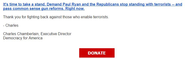 This NewsBuster just received an email from DFA admitting "the tragic situation in San Bernardino is still going on." And yet, because Republicans respect the Second Amendment, DFA accuses "Paul Ryan and the entire Republican party" of "aiding and abetting terrorists," "standing with terrorists," and being people who "enable terrorists." Of course it's all about that button at the bottom of the email: DONATE.