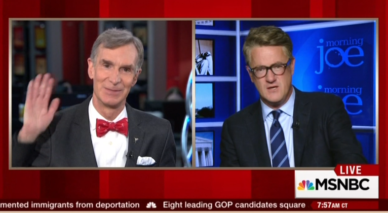 Morning Joe Tuesday featured a discussion with Bill Nye, known as the Science Guy from his television days, and his new book, “Unstoppable.” The book is about getting America to lead on fighting Climate Change, particularly in transitioning from fossil fuels to wind and solar energy. Scarborough on Climate Change, threw to Nye, “It gets more complicated when you look at the situation in China and the situation in India. How important is it now that not only do we obviously, conserve more here in the United States but also have the impact to get China and other developing countries to curb their emissions as well?”