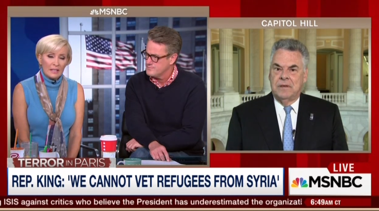 Morning Joe featured on Tuesday, an interview with Congressman Peter King. Early into the segment, Mika Brzezinski began a war of words with Congressman King. After Brzezinski introduced the topic, King stated, “I'm extremely concerned because what the President is telling us is not true. We cannot vet the refugees from Syria. There are no database to work against. There are no government records. When I talk to people involved in the vetting, they have no confidence at all in the people that are being allowed in.” Brzezinski interrupted the Congressman, saying that “there is vetting,” and arguing that he was wrong. What followed was a tense segment where the Morning Joe crew questioned King on his statements and his argument’s credibility.