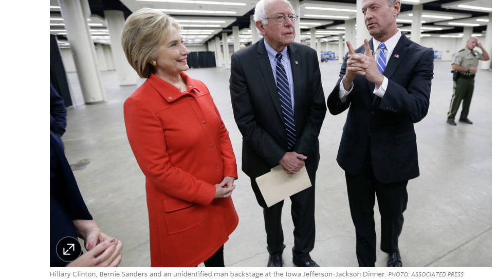 "Hillary Clinton, Bernie Sanders and an unidentified man backstage at the Iowa Jefferson-Jackson Dinner. PHOTO: ASSOCIATED PRESS"