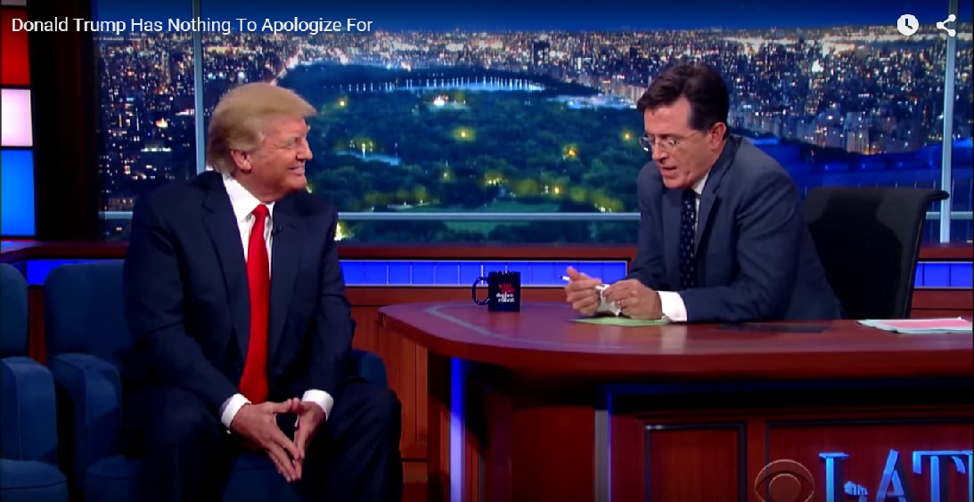 That was the title of a Politico story by Ben Schreckinger about Donald Trump's appearance last night on CBS's Late Show hosted by Stephen Colbert. Huh? Did Ben see the same show as everybody else because your humble correspondent was surprised at how amiable the interview was. You can see most of the interview below and judge for yourself. Here is part of what Schreckinger wrote in trying to score liberal points at the expense of Trump in contrast to rather friendly reality: