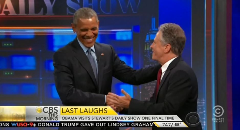 All three networks on Wednesday hyped Barack Obama's final appearance on The Daily Show, but it was CBS that offered the most nostalgic, sentimental coverage. This Morning reporter Vladimir Duthiers reminisced, "Like two old friends just enjoying each other's company, Tuesday night, Jon Stewart and President Obama both reflected on the approaching conclusion of their careers."