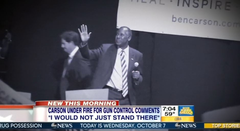 An NBC graphic identified, “Ben Carson's Controversial Comments on Guns.” Over on Good Morning America, co-host George Stephanopoulos declared, “Republican presidential hopeful Ben Carson feels the heat for comments on gun control.” Reporter Cecilia Vega knocked the “controversial comments.”