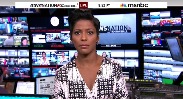 In her show NewsNation, MSNBC host Tamron Hall continued the day’s one-sided coverage by hosting, along with others, “Black Lives Matter” activists Deray McKesson and Marissa Johnson in separate full-length segments. Both blasted America’s law enforcement officers and labeled America as a generally anti-black society.