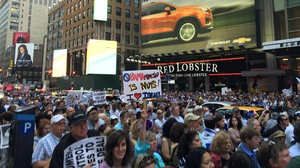 Reporter Jonathan Weisman briefly brushed over it in a 27-word sentence: “In New York, opponents of the accord organized a large protest in Times Square on Wednesday evening, drawing thousands of people to demand that Congress reject it.”