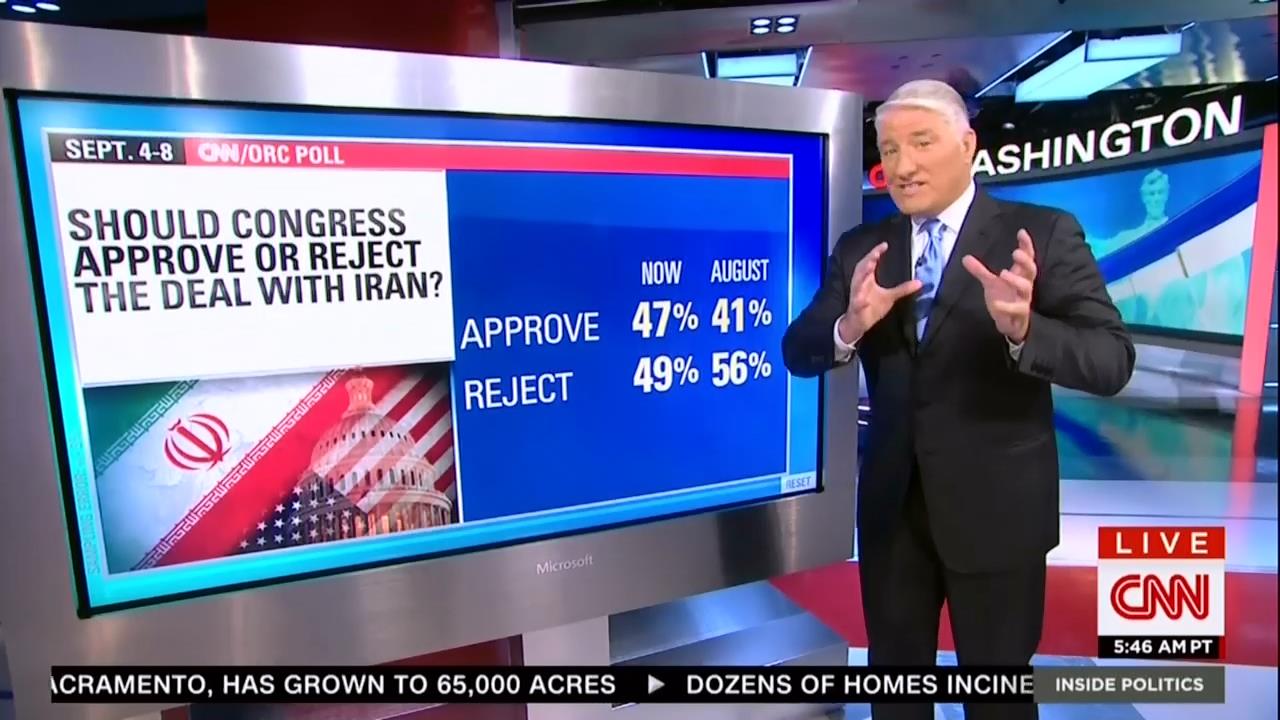 Most of these results have been ignored on CNN's air. The one significant poll result mention came on Sunday morning’s Inside Politics. John King reported 47 percent said Congress should approve the Iran deal (while 49 percent said no.) Notice King only reports half that finding: