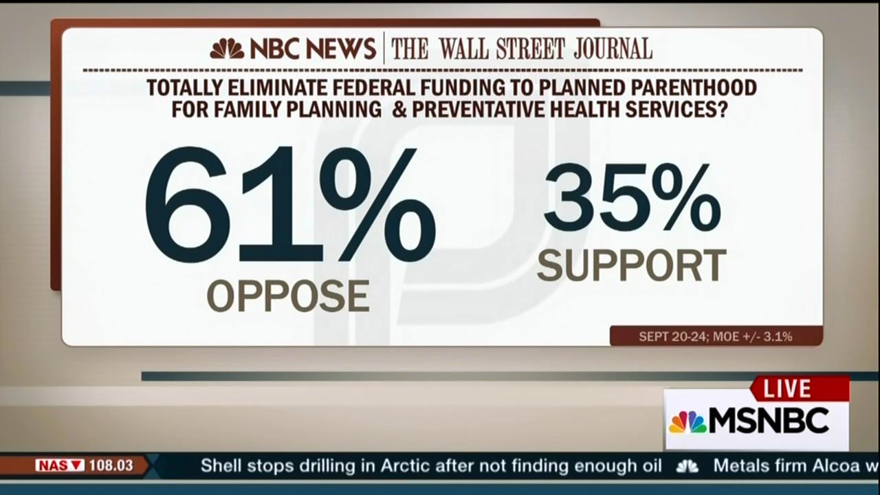 What? “Yep, you read that right: In fact, Planned Parenthood is the most popular entity in our brand new NBC News/Wall Street Journal poll, registering a positive rating of 47 percent compared to a negative rating of 31 percent. That's virtually unchanged from the last time our pollsters asked about the group in July, even though a majority (65 percent) of Americans now say that they have heard about the videos, which pictured Planned Parenthood employees discussing the use of tissue from aborted fetuses.”