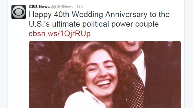 CBS News may not be in the habit of celebrating wedding anniversaries on its Twitter page. George H.W. Bush and Barbara Bush celebrated their 70th anniversary in January (didn't find a tweet or online article from CBS News), but it celebrated Bill and Hillary Clinton's "rocky union" today: